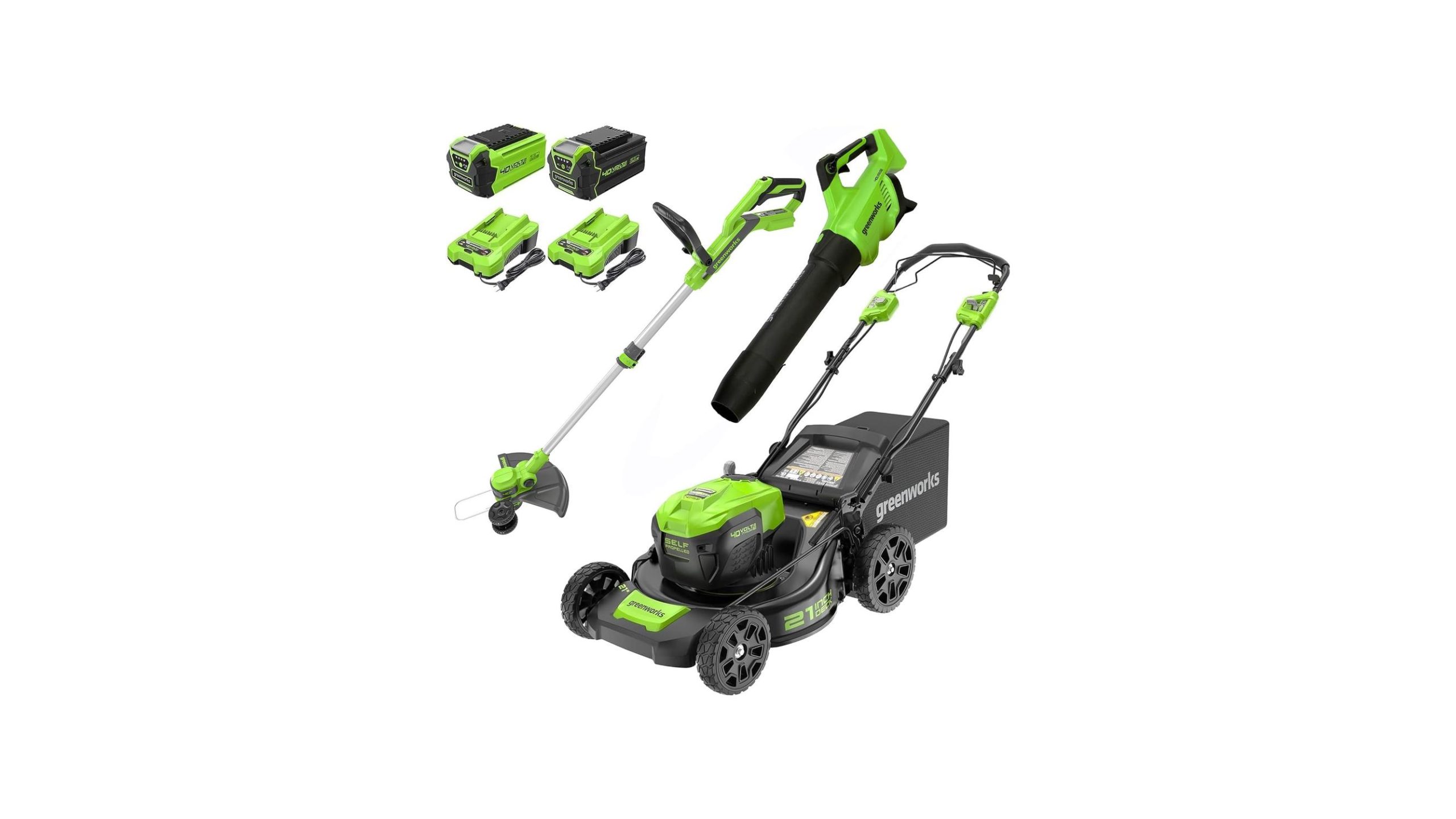 - Tired of wrestling with gas-powered yard tools that are loud, messy, and hard to start? The Greenworks 40V 21″ Self-Propelled Mower, Axial Leaf Blower, 12″ String Trimmer with Batteries and Chargers is here to revolutionize your outdoor chores with its powerful, battery-driven system. This all-in-one kit offers a cohesive and convenient way to maintain your lawn and garden, promising efficiency and ease of use for a variety of tasks.