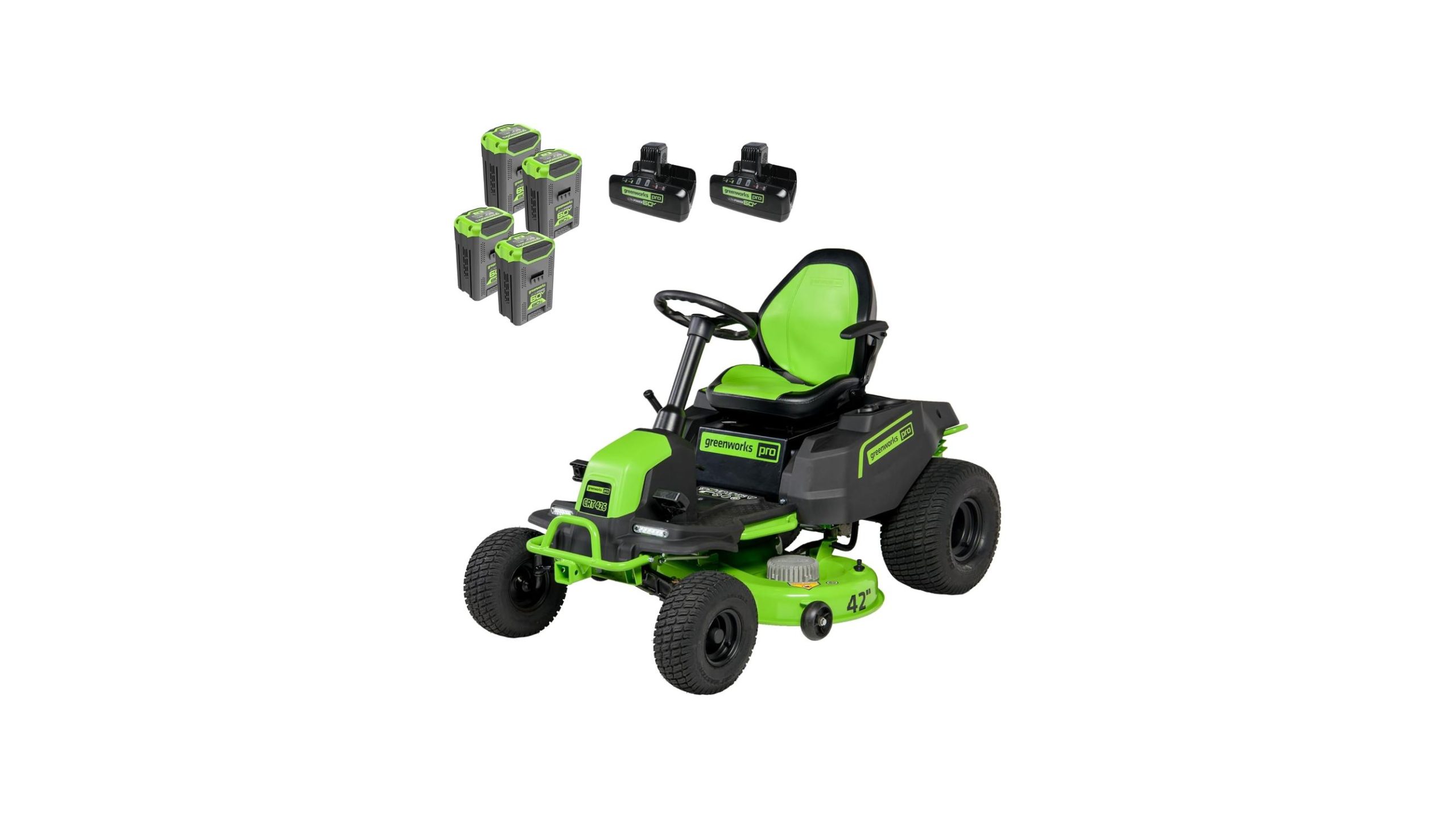 - Tired of the noisy, fume-spewing gas mower and ready for a cleaner, quieter lawn care experience? The Greenworks 60V 42” Cordless Electric CrossoverT Riding Mower, complete with (4) 8.0Ah Batteries and (2) Dual Port Turbo Chargers, might just be the revolutionary upgrade your yard has been waiting for. This comprehensive package promises a powerful and convenient approach to lawn maintenance, ditching gas for good.