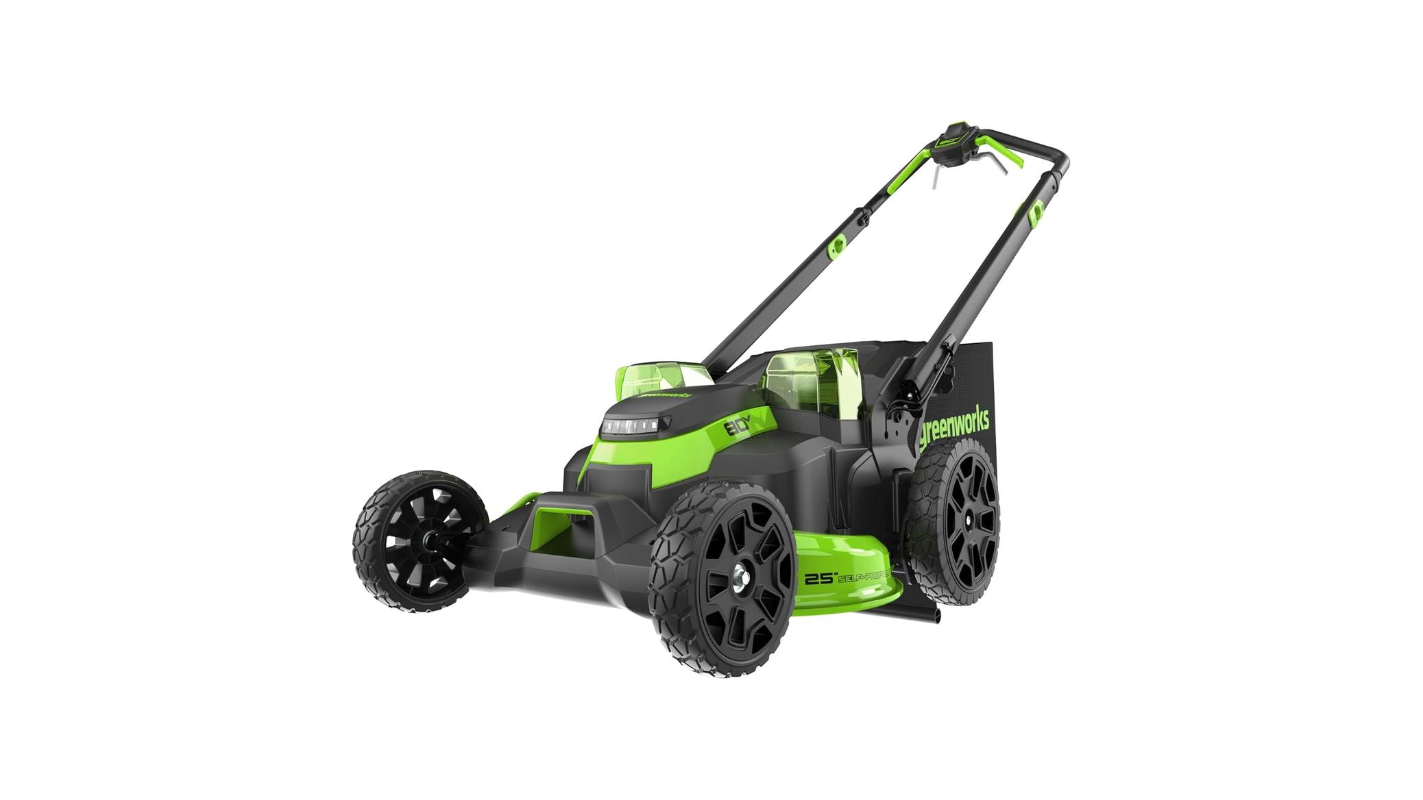 - Tired of the hassle of gas-powered mowers and tangled cords? The Greenworks 80V 25″ Brushless Cordless (Self-Propelled) Dual Blade Lawn Mower (LED Headlight + Aluminum Handles), Battery And Charger Not Included offers a powerful and convenient electric alternative for maintaining your lawn. This innovative mower promises to streamline your yard work with its robust features and user-friendly design.