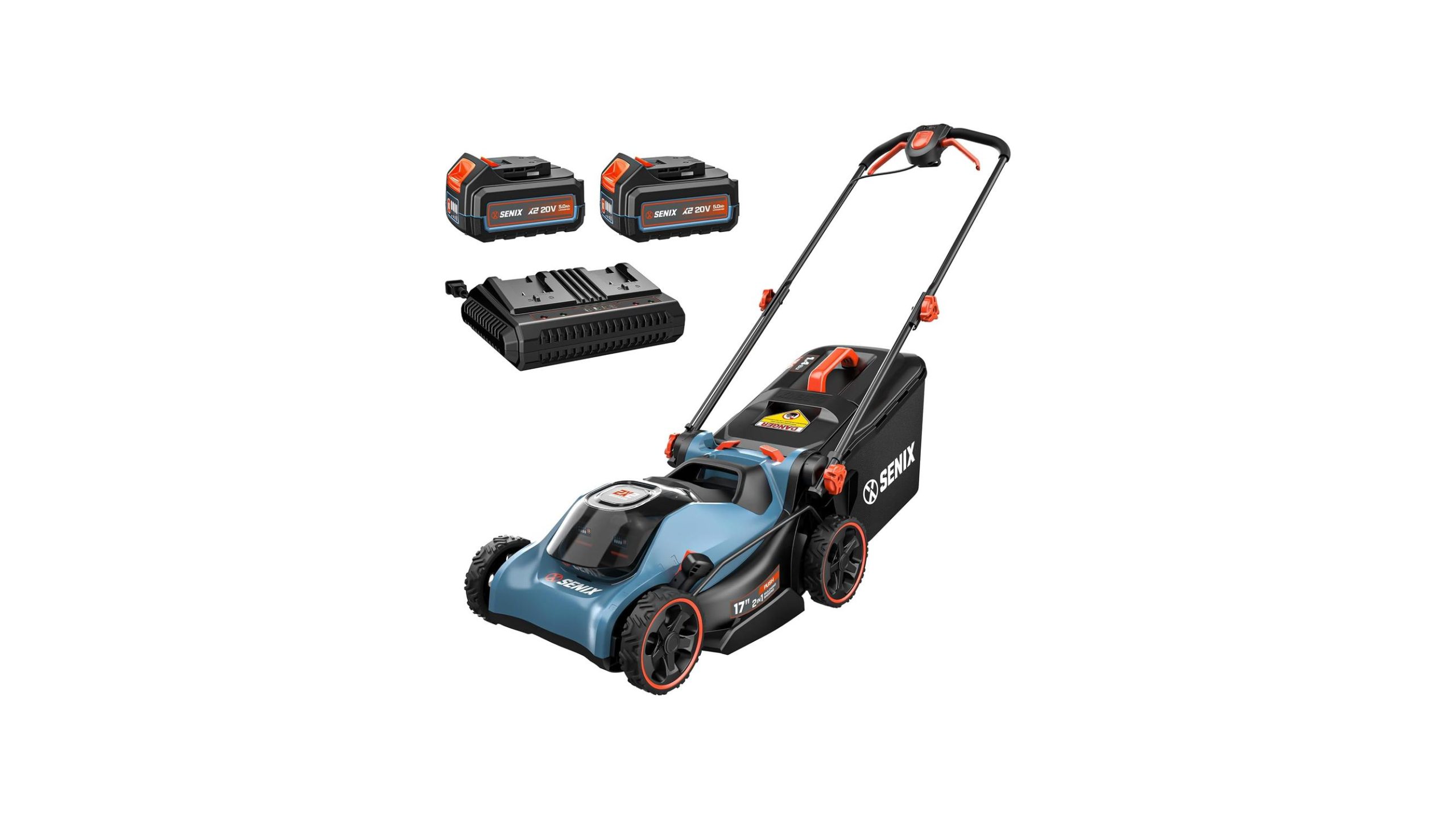 The SENIX 40V 17″ Electric Lawn Mower is designed to deliver up to 45 minutes of runtime using the included dual 5Ah batteries.